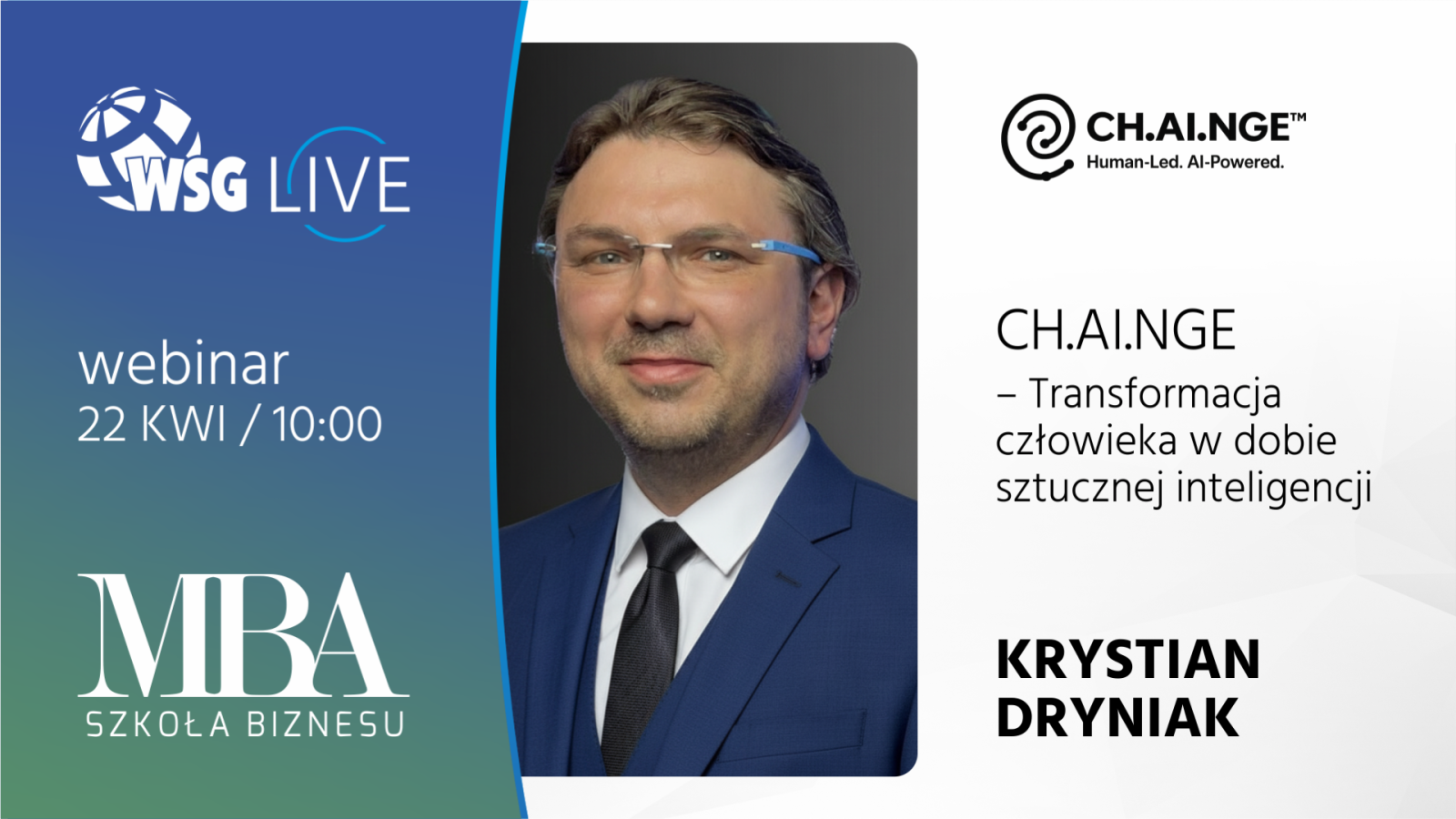 Wykład oparty jest na autorskim meta-frameworku CH.AI.NGE™ (Human-Centered Transformation in the Age of AI), który odpowiada na lukę współczesnej debaty o AI: brak spójnej architektury wyjaśniającej, jak człowiek powinien myśleć, decydować i zachowywać odpowiedzialność, gdy sztuczna inteligencja staje się częścią procesu